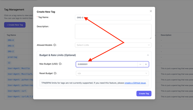 Create a new tag and set max_budget and budget_duration